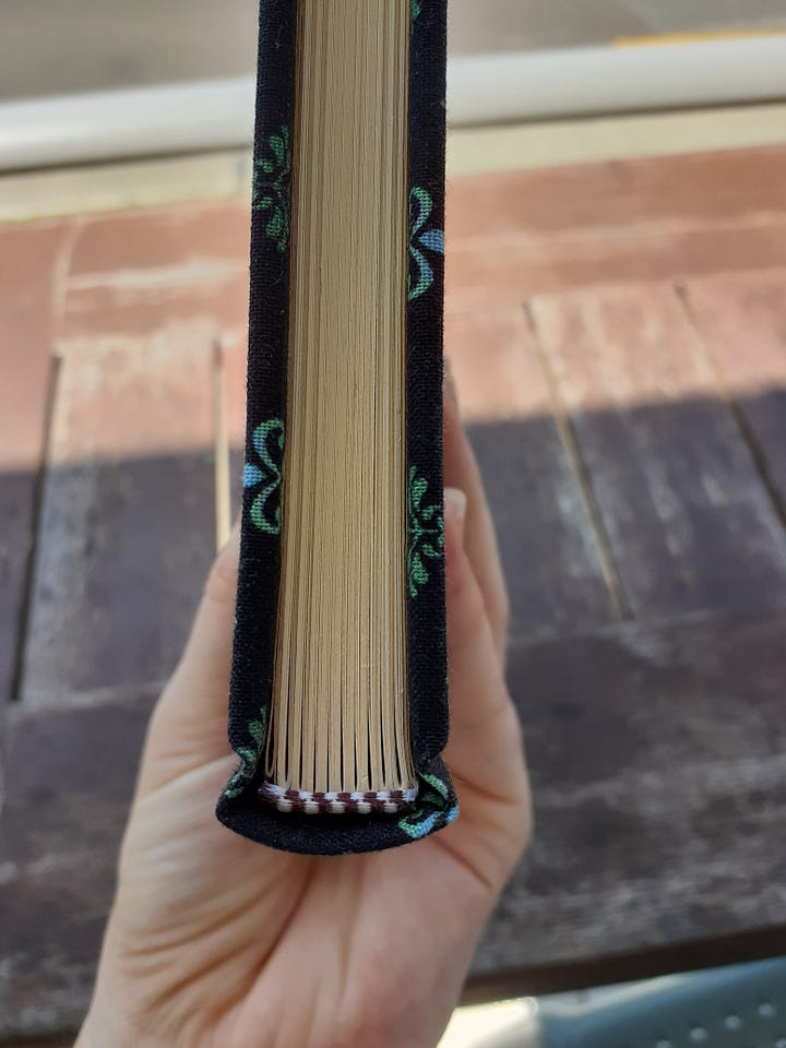 It starts as mere sheets of paper, a pretty square of cloth, yards of waxed thread, and grey, drab bookboard. And somehow — holding one’s breath the entire while — one is able to assemble these pieces into a functional, gloriously beautiful book!!?!? It boggles the mind. The way books work is brilliant, y’all.